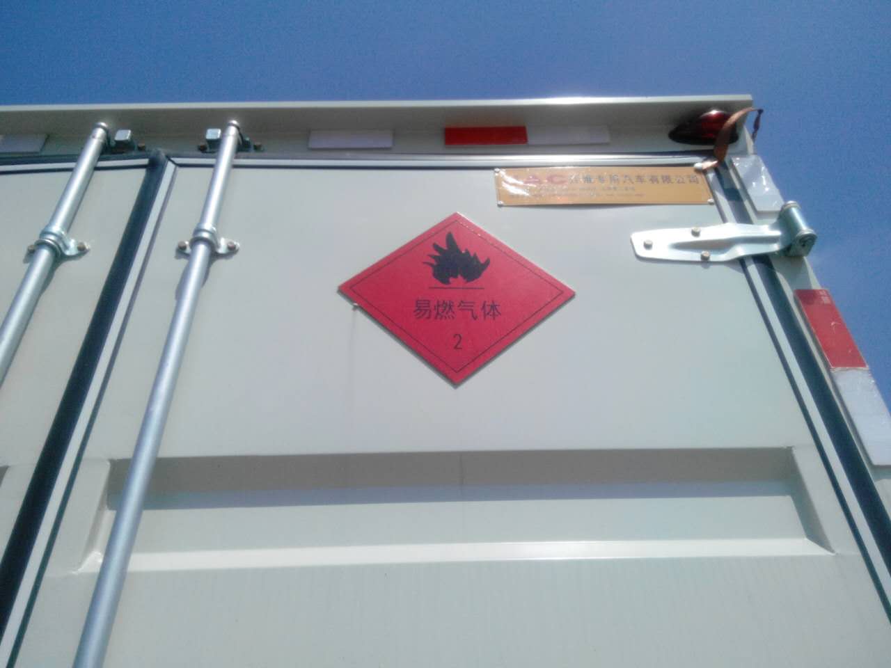 | 運輸介質(zhì)為易燃?xì)怏w氣瓶,類項號為2.1;選裝帶液壓尾板,選裝不帶側(cè)門,側(cè)后防護材料為Q235A,螺栓連接,后防護截面尺寸(高×寬)為100mm×50mm,離地高度為424mm;選用危險品運輸車專用底盤,僅選用底盤子午線輪胎,ABS系統(tǒng)控制器型號:CM4YL,ABS系統(tǒng)控制器生產(chǎn)企業(yè):廣州市科密汽車制動技術(shù)開發(fā)有限公司,前輪安裝盤式制動器,安裝限速裝置,限速80km/h,排氣管前置,安裝具有衛(wèi)星定位功能的行駛記錄儀.僅選用底盤發(fā)動機HFC4DA1-2C和YC4FA115-40,對應(yīng)油耗值(L/100km)為12.7和12.5 | |||