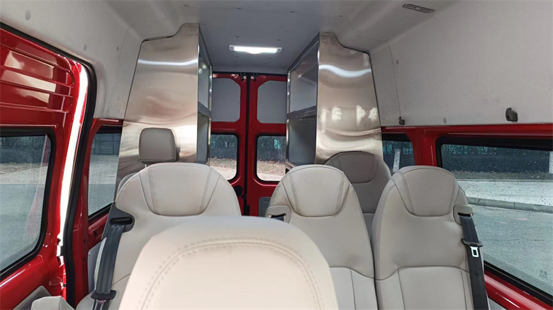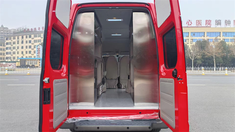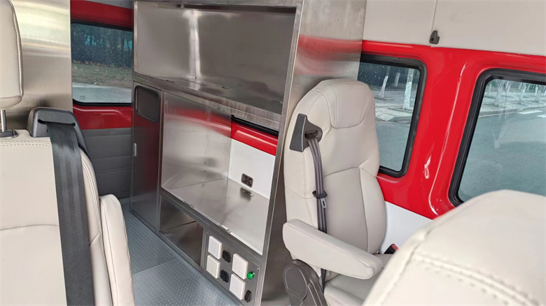鋁花紋地板防滑、耐磨、易清洗,尾門折疊擔(dān)架,供氧系統(tǒng),10升醫(yī)用氧氣瓶2個及專用減震卡箍,固定減壓閥、濕化瓶(瓶閥一體)
