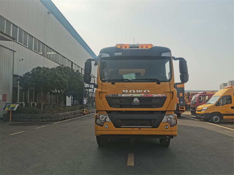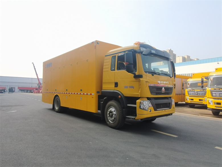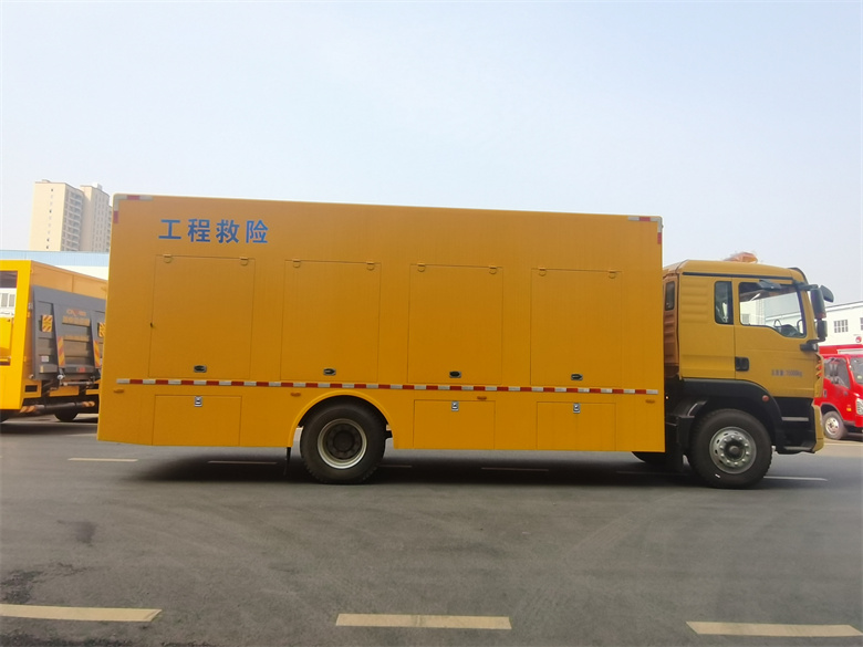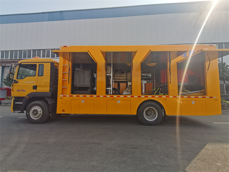 重汽豪沃3000方排澇車-工程救險車標(biāo)準(zhǔn)配置:整車采用優(yōu)質(zhì)碳鋼方管骨架,1.5mm 厚蒙皮,先進的噴涂技術(shù),車廂整體防銹、防腐使用年限更長,廂體外部鋼材為優(yōu)質(zhì)冷軋鋼板,內(nèi)襯優(yōu)質(zhì)冷軋鋼板折彎骨架,工藝先進,強度牢固。廂體為全密封結(jié)構(gòu),具備運輸、防雨、防腐、防火、防銹要求。車廂尾部為對開門。發(fā)電機組進排風(fēng)消聲處理,消聲器做降噪處理。車輛安裝四只液壓支撐腿,可在駐車狀態(tài)均分車輛靜壓,保護車輪及彈簧鋼板。選用進口優(yōu)質(zhì)多路閥組,液壓支撐缸采用進口密封件,單支腿靜載荷 8 噸,加裝雙向液壓鎖。底盤發(fā)動機全功率取力液壓動力源,驅(qū)動排水機器人、液壓油箱、散熱器、水帶液壓卷盤、液壓油管卷盤等液壓系統(tǒng)工作。定制分動箱,進口高壓液壓油泵,高效能轉(zhuǎn)換,平穩(wěn)無極調(diào)速,為車輛節(jié)約空間,整車液壓系統(tǒng)布局合理。