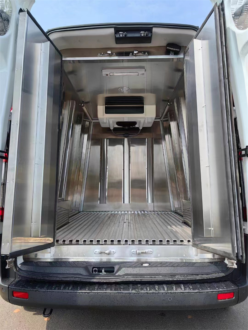 福特全順T6疫苗冷鏈運(yùn)輸車(chē)專(zhuān)用配置:內(nèi)膽圓弧式箱體, 廂體采用外玻璃鋼、內(nèi)不銹鋼板、中間5CM 厚保溫板,5面通風(fēng)槽,溫濕度記錄儀,箱體頂部安裝LED照明燈 為后艙提供照明,后艙卸貨專(zhuān)用照明燈 可調(diào)節(jié)照明視覺(jué),為工作人員提供充足的亮度,內(nèi)層不銹鋼 國(guó)家認(rèn)可的食品級(jí)不銹鋼,具有良好的耐蝕性、耐熱性,低溫強(qiáng)度和機(jī)械特性,通風(fēng)導(dǎo)流槽 確保貨物底部,側(cè)部不與廂體完全接觸,保證整個(gè)廂體(尤其底部)冷氣循環(huán),紫外線消毒燈能夠有效保證對(duì)廂體的消毒,不銹鋼門(mén)鎖件 具備重量輕、強(qiáng)度高、耐腐蝕,溫濕度記錄顯示,GPS定位,藍(lán)牙打印,高低溫超限自動(dòng)報(bào)警功能,在駕駛室里即可操作,簡(jiǎn)單方便!制冷設(shè)備安裝國(guó)產(chǎn)雙溫制冷機(jī)組,夏天制冷,冬天加熱。選裝進(jìn)口開(kāi)利或冷王制冷機(jī)組。
