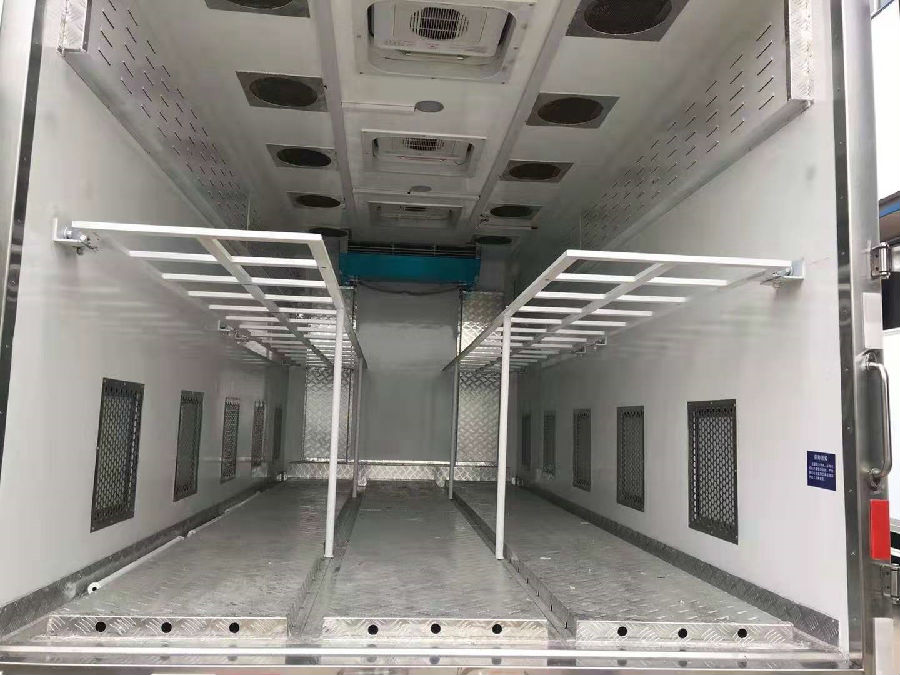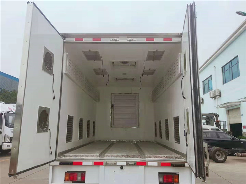車廂左右側(cè)板根據(jù)廂體長(zhǎng)度開多個(gè)帶網(wǎng)孔板通風(fēng)窗戶,車頂和尾門配電子排氣扇,避免二氧化碳?xì)怏w聚集。