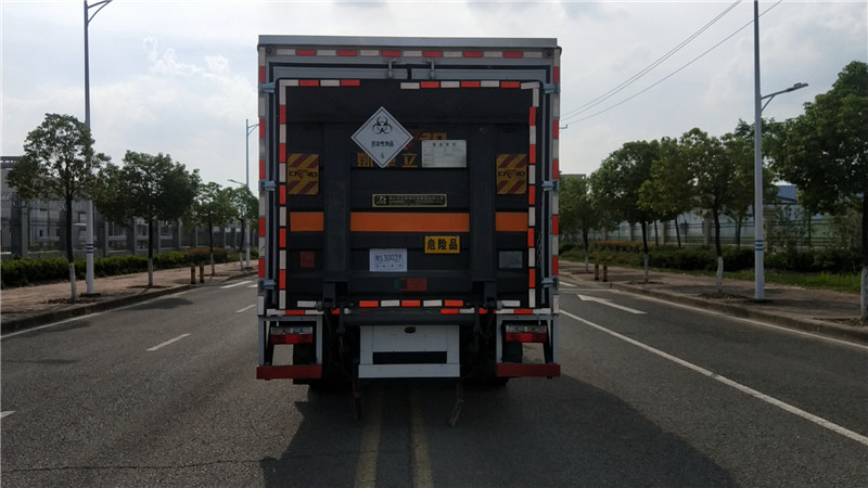 醫(yī)療廢物轉(zhuǎn)運(yùn)車(chē)車(chē)廂內(nèi)前板安裝有不銹鋼臥環(huán),兩側(cè)板安裝不銹鋼護(hù)板,用來(lái)固定廂內(nèi)的不銹鋼橫撐桿,可調(diào)整長(zhǎng)度的捆綁帶通過(guò)橫撐桿和前板上的不銹鋼臥環(huán)將專用塑料密封袋周轉(zhuǎn)箱牢固固定在車(chē)廂內(nèi),防止周轉(zhuǎn)箱在行車(chē)中的翻轉(zhuǎn)和泄露。