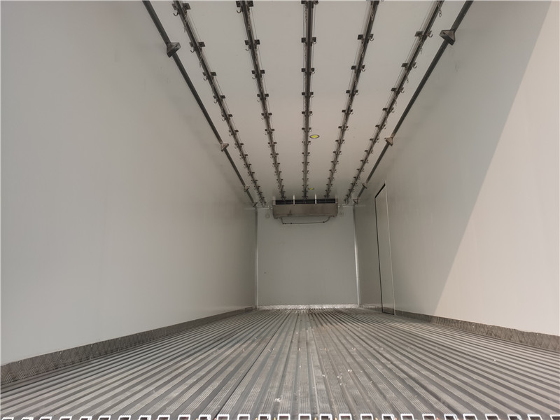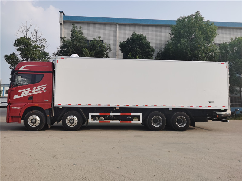 一汽解放JH6 460馬力前四后八9米6冷藏車標(biāo)準(zhǔn)配置: 冷藏廂體內(nèi)尺寸9400x2430X2480(mm),內(nèi)部空間約56.6方,廂體配置:斷橋隔熱工藝、整體結(jié)構(gòu)框架;內(nèi)外玻璃鋼板夾聚氨酯保溫層真空復(fù)合而成,底板為鋁花紋板,龍骨斷橋?yàn)樗赡緩?fù)合板;木質(zhì)隔溫結(jié)構(gòu);廂體厚度為8cm;不銹鋼包角;最新款鋁合金包邊型材;廂體內(nèi)部采用3個(gè)LED照明燈;后門框?yàn)?mm厚不銹鋼材質(zhì);門框密封條為橡膠材質(zhì);加厚型不銹鋼鉸鏈及鎖件;副駕駛邊開雙開門(選開單側(cè)門),廂體四周加裝鋁花紋板,廂體頂部加裝5排肉鉤導(dǎo)軌,廂體地板加裝鋁合金通風(fēng)槽,可拆卸防護(hù)網(wǎng),加裝檢修爬梯。制冷機(jī)組采用凱雪1090超薄制冷設(shè)備,可選裝進(jìn)口開利或冷王獨(dú)立制冷機(jī)組。