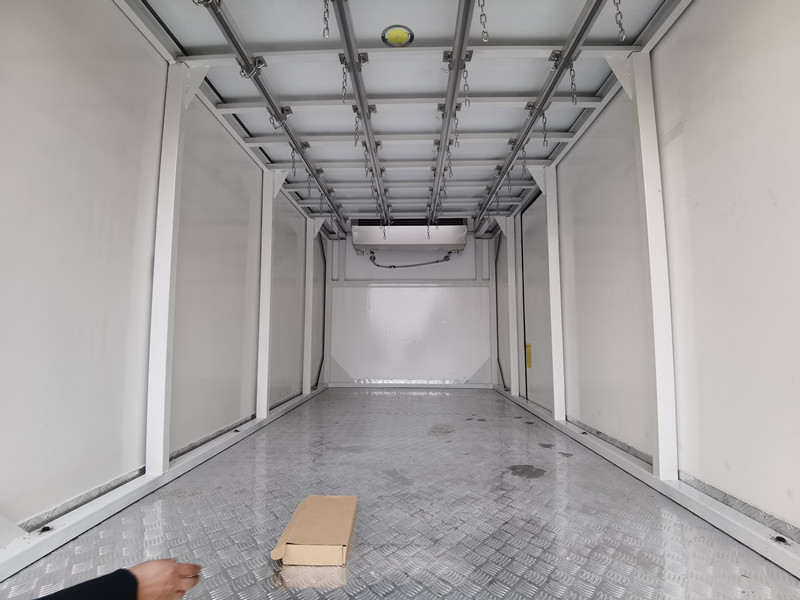 五十鈴KV100藍(lán)牌可拆卸肉鉤冷藏車上裝配置:冷藏廂內(nèi)尺寸:4075*2060*1860mm,廂體采用真空吸附、液壓吸附一體成型生產(chǎn)線制造,三明治復(fù)合粘接,保溫性能達(dá)到國(guó)家A級(jí)標(biāo)準(zhǔn)。廂板材質(zhì):內(nèi)外壁板選用國(guó)內(nèi)優(yōu)質(zhì)2mm玻璃鋼(不吸光、隔熱性好、硬度強(qiáng)、抗氧化);中間保溫層為XPS擠塑聚苯板;廂體厚度8CM。地板采用鋁花紋板,門邊條采用迷宮式橡膠密封條。廂體周邊鋁合金包邊,不銹鋼包角,不銹鋼門鎖,不銹鋼門框及合頁(yè),廂體內(nèi)節(jié)能LED照明燈。